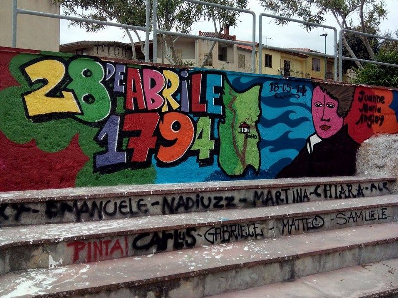 BÀNARI. Acumpridu su murale in onore de Juanne Maria Angioy e de su 28 de abrile de su 1794. Custu mangianu sos pitzocos de s'iscola mèdia, ghiados dae s'artista "Super" e dae Carla Porcheddu e Maria Vitòria Porcu, ant disinnadu e coloradu unu chirru de s'anfiteatreddu postu a palas de sa Ludoteca comunale pro mèdiu de tanta passione e unas cantas bomboleddas de vernitze. A pustis de àere seberadu unu de sos disignos fatos in sos pabiros sàbadu coladu, "Super" at mustradu a sos pitzinnos sas tècnicas netzessàrias pro àere un'òpera galana e bene fata, partende dae s'impreu de sos colores prus craros pro arribare, in fines, a una bona definitzione de sos inghìrios. Su murale, finidu a borta de die, mustrat a maduru sa data in ue ruet "Sa Die de sa Sardigna", sa cara de su rivolutzionàriu bonesu, e cantos de s'innu antifeudale iscritu dae Frantziscu Ignàtziu Mannu. Sàbadu chi benit su traballu at a èssere presentadu in su Palatu Solinas.