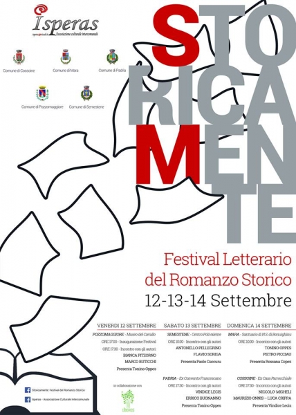 MEILOGU. Tutto pronto per “StoricaMente”, il festival letterario improntato interamente al romanzo storico che si terrà dal 12 al 14 settembre nei comuni di Pozzomaggiore, Padria, Mara, Cossoine e Semestene. Organizzato dall'associazione culturale intercomunale "Isperas" (che da anni lavora in questi cinque paesi organizzando diverse manifestazioni ed attività culturali), dall'Associazione Liberos (che riunisce tutta la filiera del libro in Sardegna) e patrocinato dalle riapettive amministrazioni comunali, "StoricaMente" si presenta agli appassionati, ai curiosi e a tutti i cittadini del Meilogu (e non solo) con un programma di spessore con personaggi del calibro di Marco Buticchi, Bianca Pitzorno, Errico Buonanno e Flavio Soriga.
