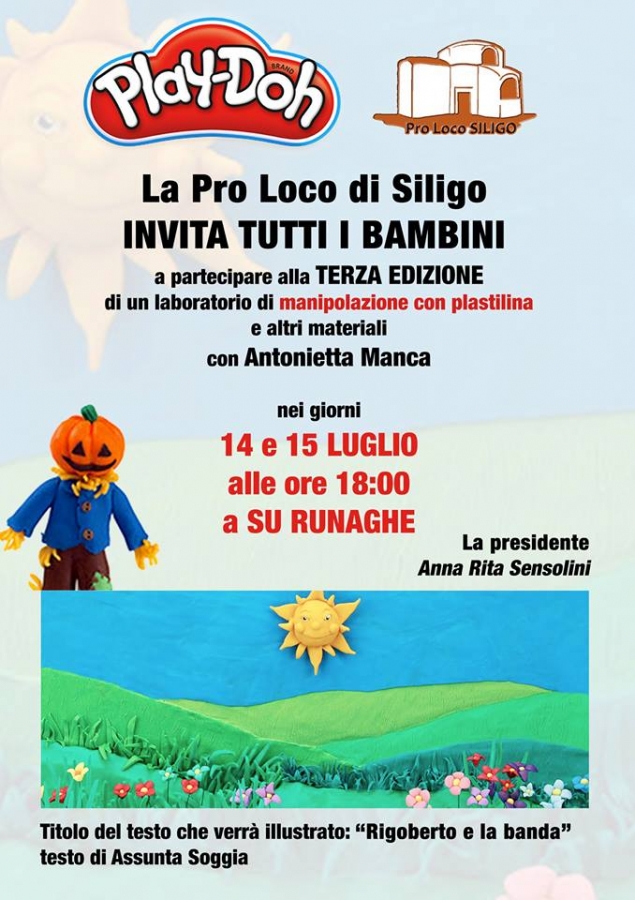 Siligo. La Pro loco, presieduta da Anna Rita Sensolini, organizza la terza edizione del laboratorio di plastilina e altri materiali dedicata ai bambini che si terrà giovedì 14 e venerdì 15 luglio, alle 18, nello splendido punto panoramico de “Su Runaghe”. Le giornate saranno caratterizzate dalla presenza di Antonietta Manca e dalla lettura di un racconto dal titolo “Rigoberto e la banda”, scritto da Assunta Soggia. Durante la manifestazione, tutti i bambini potranno riprodurre personaggi famosi attraverso l’uso della plastilina. Il venerdì è previsto uno spettacolo musicale a cura dei bambini che, attraverso l’utilizzo di strumenti artigianali, eseguiranno alcune canzoni. «Fantasia e divertimento saranno gli ingredienti principali per far vivere momenti di gioia e divertimento a tutti i bambini che vorranno trascorrere con noi due pomeriggi di questa calda estate», ha dichiarato Sensolini. Alla serata sono invitati anche tutti i genitori e i nonni.