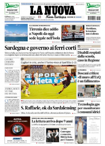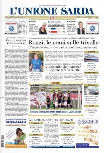 «Renzi, le mani sulle trivelle» e «Sardegna e Governo ai ferri corti» sunt sos tìtulos de sas novas printzipales chi agatamus oe in sas primas pàginas de L'Unione Sarda e La Nuova Sardegna. Cun su decretu “Sblocca Italia”, difatis, at a èssere s'istadu – pro mèdiu de su ministeru de s'Ambiente – a fàghere sas valutatziones de impatu ambientale. S'afòrtigat, duncas, sa furriada tzentralìstica de Roma cunforma a s'autonomia regionale. In s'ìnteri sa Regione sighit a chèrrere su dinare de sa “vertèntzia intradas”: «Non ritiramus sos recursos».