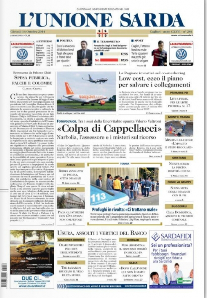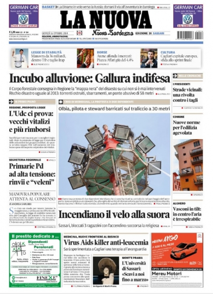 A metade de pà gina, cun foto manna, sa protesta de duos dipendentes de Meridiana artziados a 30 metros dae terra e determinados a bi firmare: «Amus a falare cando ant a èssere revocados sos litzentziamentos».