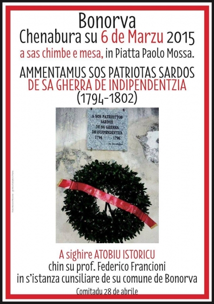 BONORVA. Questo pomeriggio alle 17.30 in Piazza Paulicu Mossa il "Comitadu 28 de Abrile" ricorderà i patrioti sardi della Guerra di Indipendenza (1795-1802). Seguirà , presso la sala consiliare, un incontro dal carattere storico con il Prof. Federico Francioni.