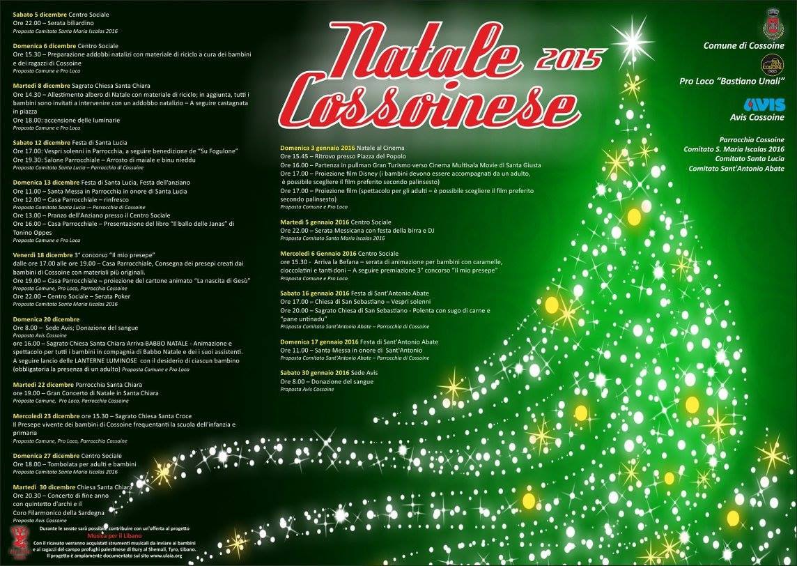 COSSOINE. L’amministrazione comunale, la Pro loco “Bastiano Unali”, la parrocchia, la sezione locale dell’Avis e i comitati di Santa Maria Iscalas, di Santa Lucia e di Sant’Antonio Abate hanno predisposto il programma degli avvenimenti per il Natale Cossoinese 2015. Si partirà sabato 5 dicembre con una serata dedicata al biliardino e si concluderà sabato 30 gennaio 2016 con la donazione di sangue organizzata dall'Avis. Durante le manifestazioni sarà possibile contribuire con una donazione al progetto "Musica per il Libano".