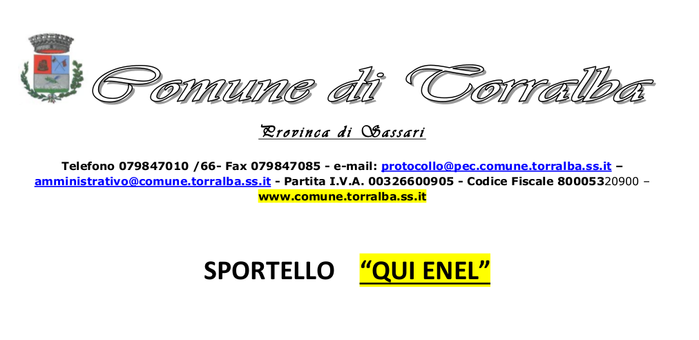Torralba. Dal mese di settembre lo sportello “Qui Enel” del Comune sarà attivo per appuntamento. Per informazioni ci si può rivolgere agli uffici comunali preposti (tributi, demografici, amministrativo e polizia municipale) o chiamando i numeri n.079847010 o 079847066. È possibile inviare anche un messaggio di posta elettronica all’indirizzo e-mail amministrativo@comune.torralba.ss.it. È necessario indicare le proprie generalità e la motivazione della richiesta.