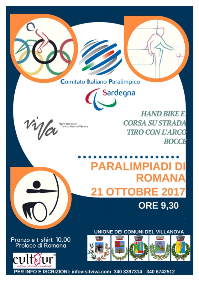 Il Comune di Romana in cooperazione con il CIP Sardegna – Comitato Italiano Paralimpico e il supporto della Cultour Società Cooperativa ORGANIZZANO per la giornata di sabato 21 OTTOBRE 2017 la manifestazione PARALIMPIADI DI ROMANA.