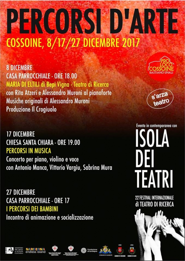COSSOINE –La Pro Loco “Bastiano Unali”, in collaborazione con il Teatro S’Arza di Sassari e l’Amministrazione Comunale,ricalca le scene di un evento, già proposto con successo lo scorso anno, in occasione dei 15 anni dell’Associazione. Si tratta di “Percorsi d’Arte”, una rassegna di teatro e musica, inserita nella cornice del 22° Festival Internazionale di Teatro di Ricerca. L’evento si compone quest’anno di tre appuntamenti, il primo dei quali vedrà il teatro di Rita Atzeri - MARIA DI ELTILI di Bepi Vigna - l’8 dicembre, presso la Casa Parrocchiale, alle ore 18.00.