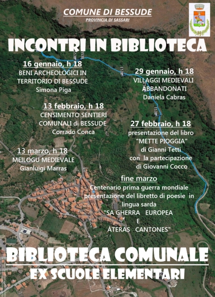 BESSUDE. Organizzati dall'amministrazione comunale, proseguono gli “Incontri in biblioteca” iniziati il 16 gennaio con una ricognizione sui beni archeologici del territorio bessudese a cura di Simona Piga (che ne aveva fatto il censimento negli anni scorsi) e proseguiti con un dibattito sui villaggi medievali abbandonati (il 29 gennaio con Daniela Cabras) e con il censimento dei sentieri comunali (il 13 febbraio con Corrado Conca).