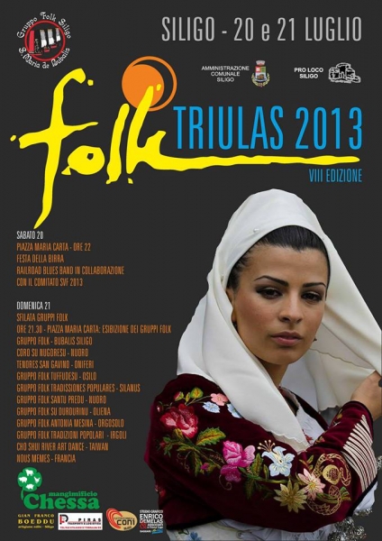 SILIGO. Ritorna “Triulas”, il festival del folklore organizzato dal gruppo “Santa Maria de Bubalis”, in collaborazione con l'amministrazione comunale e con la Pro Loco. Arrivato alla sua VIII edizione l'evento offre un programma di due giorni. Sabato 20 luglio si terrà una sorta di “vigilia” organizzata in collaborazione con il comitato San Vincenzo Ferrer 2013: dalle 22 festa della birra in Piazza Maria Carta con la Railroad blues band. Domenica 21 la festa folk con una sfilata dei gruppi che dalle scuole elementari arriveranno in piazza Maria Carta alle 21,30 per le esibizioni. Parteciperanno i gruppi “Bubalis” di Siligo, “Santu Predu” di Nuoro, “Tuffudesu” di Osilo, “Su Durdurinu” di Oliena, “Tradissiones Populares” di Silanus, “Antonia Mesina” di Orgosolo, “Tradizioni Popolari” di Irgoli, il coro “Su Nugoresu” di Nuoro, il tenore “San Gavino” di Oniferi. La serata sarà impreziosita dalla presenza di due compagini internazionali: il gruppo francese “Nous Memes” e i “Cho Shui River Art Dance” di Taiwan. Inoltre il palco vedrà la prima esibizione dei bambini di Siligo. Dopo le esibizioni dei gruppi, la serata proseguirà con un dj set.