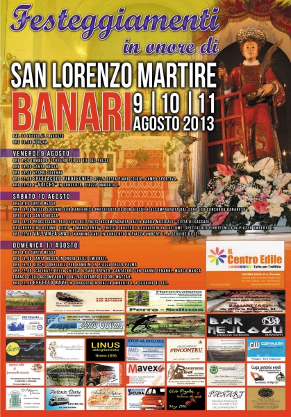 BANARI. Un comitato giovane e affiatato, guidato con perizia dal presidente Fabrizio Sassu, si appresta a organizzare la tradizionale festa in onore del santo patrono Lorenzo. Una festa all'insegna della passione e della polvere da sparo che accompagna "sa chirca" per le vie del paese le domeniche precedenti e che sarà presente nei diversi spettacoli pirotecnici della tre giorni. E, come ogni anno, saranno i classici fuochi d'artificio ad aprire ufficialmente la festa alle 22 del 9 agosto presso il campo sportivo. Il 10 concerto dei Vallanzaska. Ecco il programma per esteso: